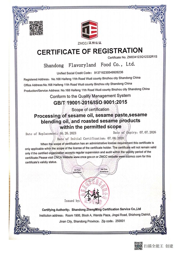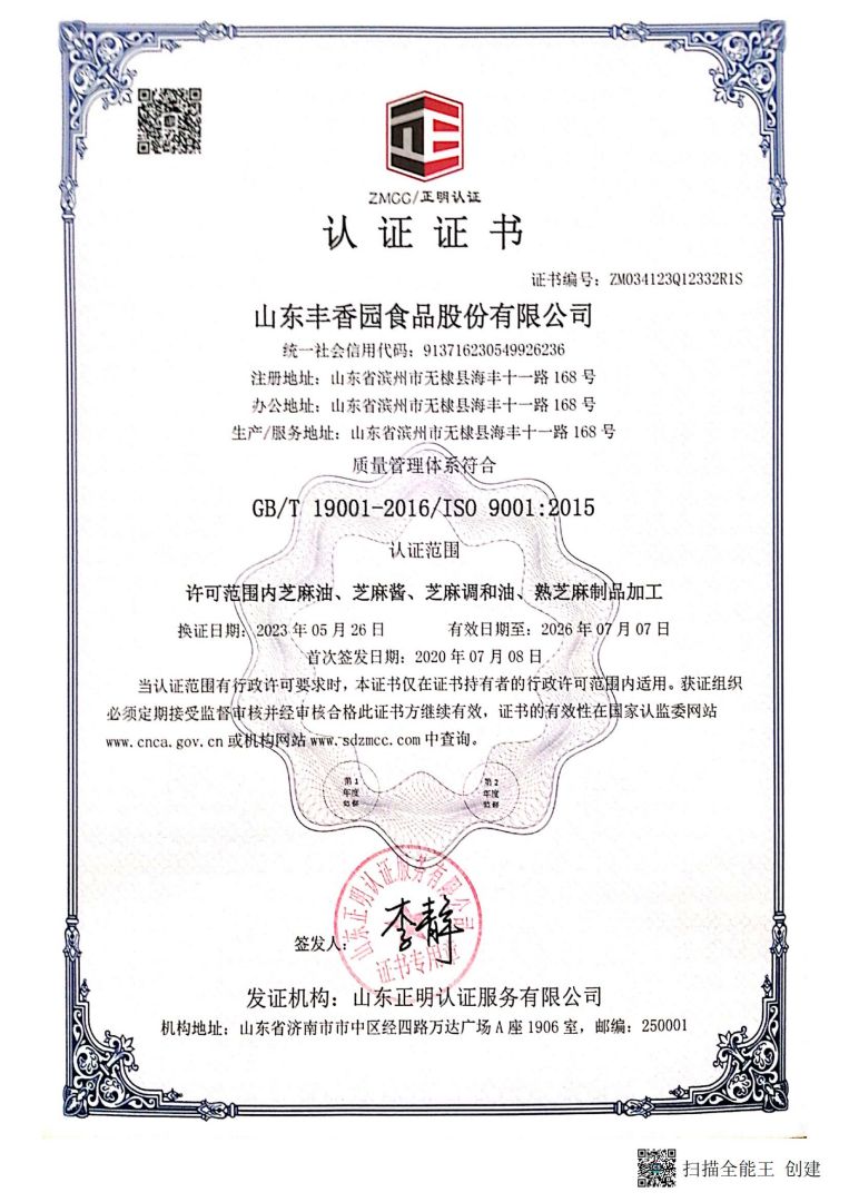 山東豐香園食品股份有限公司位于山東省濱州市無棣縣海豐十一路168號,公司擁有員工50多人,年銷售收入6000多萬元,是華北地區最大的純正芝麻香油、芝麻食品定制代加工生產、出口基地。 ? ? 豐香園小磨香油、芝麻調和油、花生醬、芝麻醬、混合醬、熟芝麻制品均已通過英國零售商協會BRC認證、歐盟 美國和國內有機、HACCP體系認證,是山東省出口食品備案企業。 ? ? 豐香園小磨香油、芝麻香油、芝麻醬以傳統石磨工藝精制而成,從原料進庫到成品出廠,經過12道工序嚴格檢測,確保了產品符合國家標準和出口標準,讓廣大消費者吃的放心,吃的營養,吃的健康,豐香園公司致力于打造中國純正芝麻香油、芝麻醬領導品牌。? ? 在歷史和未來之間,“豐香園”一直是純真香油的誠信領導者,豐香園芝麻食品公司用良心磨油,拒絕摻假,每一滴芝麻油都是純正的,被廣大消費者頌有“無棣特產黃金油”,“魯北瓊漿”的美譽。 ? ? 作為中國一家專業生產小磨芝麻香油、芝麻醬的現代化企業,豐香園芝麻香油秉承“真色、真味、真香”的三真級行業新標準,始終走在行業標準的前列。從芝麻采購、驗收檢測、生產、包裝、銷售,一體化產業鏈,真正做到無污染。? ? 豐香園芝麻食品定制代加工產品,已覆蓋山東、兩廣、京津唐、東北及華南地區,出口到日本、韓國、及東南亞等國家和地區。